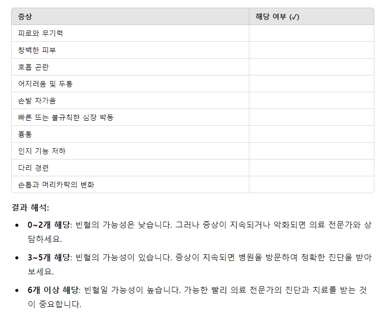 자가 진단 체크리스트 : 빈혈의 일반적인 증상(피로, 창백한 피부, 호흡 곤란 등)을 기준으로 자가 진단 체크리스트를 활용할 수 있습니다. 그러나 이는 정확한 진단을 위해서는 한계가 있으며, 전문적인 진단이 필요합니다.