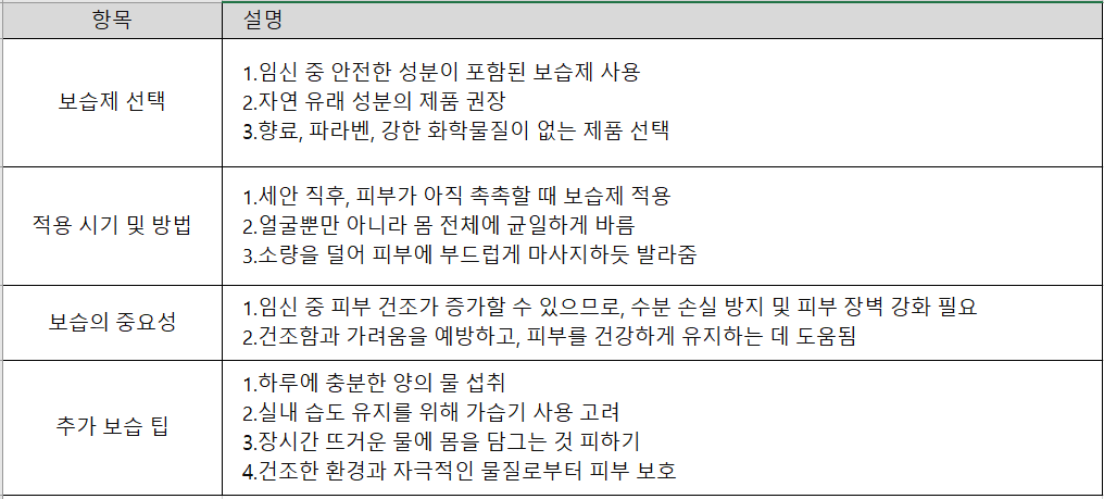 | 정기적인 검진: 임신 중에는 피부 상태가 변할 수 있으므로, 정기적으로 피부과 전문의와 상담하여 피부 상태를 모니터링하고 치료 계획을 조정하는 것이 중요합니다. |